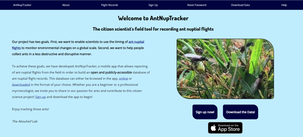A team out of the Abouheif Lab at McGill University, Canada, has started a frankly brilliant programme. They have made an app where members of the public can download the app and submit information about nuptial flights in their area. The app is called AntNupTracker and is currently available on IOS with an Android version on the way! They have told me that the app “…Has two major goals. The first is to facilitate studies of the links between weather and the timing of ant nuptial flights. The second is to provide better knowledge of the timing of ant nuptial flights so that collectors can gather ants in a manner that is less disruptive to existing habitats.” Conservation and information is the goal and you can all help. Citizen science gives people the opportunity to contribute to science without any fancy (and expensive. So expensive) degrees. And you can write about ant flights, anywhere in the world!