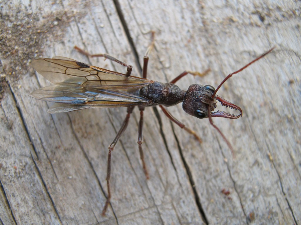 Now if you are like me, not eating and surviving on your back muscles for months in a cold, dark hole isn’t all that appealing. I know, I am weird like that. Many species of ants also agree and feed while founding their colonies. These species are Semi-Claustral. The queen will leave the nest in search of food. This is dangerous as she is vulnerable to predators but she has the added benefit of not slowly starving to death. Also the brood will get food so the first workers will be stronger, larger and more capable. Both strategies have benefits. Claustral and Semi-Claustral species are usually easy to distinguish as claustral queens are often larger to store their fat reserves. An example of a Semi-Claustral species would be Myrmecia sp, Bull ants. Below is a picture of a bull ant queen. Although she is much larger, notice the thinner thorax.