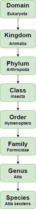 Taxonomy is “the branch of science concerned with classification, especially of organisms.” Usually how they are related to each other genetically (it is now at least). Our current methodology of sorting organisms is beautiful. It is an ingenious way of doing it. At least it was. It was first used by Carl Linnaeus in the 1700s. He was a great man and we still use his methods and structures today. Very basically, all life is sorted by these categories you may have learned at school, using Atta sexdens as an example:
